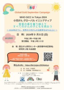 In conjunction with Childhood Cancer Awareness Month in September, the WHO Global Initiative for Childhood Cancer (WHO GICC) in Tokyo 2024, which has been held annually since 2021 as part of the Global Gold September Campaign, held an international symposium entitled “Save Every Child in the World from Cancer: More than 60% Cure for Childhood Cancer by 2030”. The symposium was held in conjunction with the Global Gold September Campaign “Global Initiative for Childhood Cancer (WHO GICC) in Tokyo 2024,” which has been held annually since 2021 as part of the Global Gold September Campaign “Global Childhood Cancer Awareness Campaign.